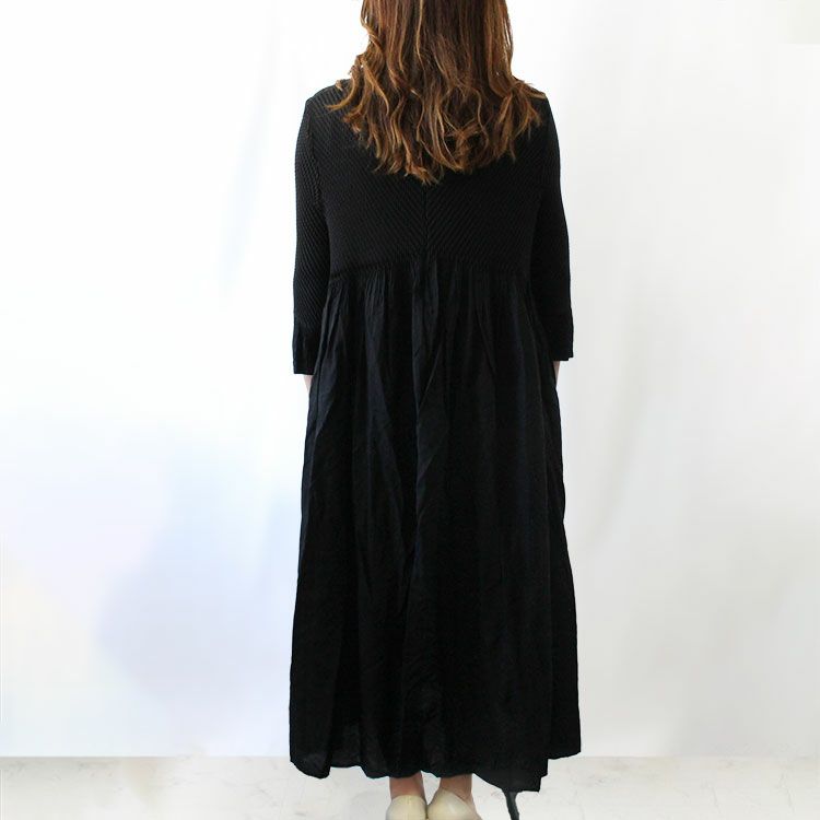 レース柄ドッキングデザイン八分袖プリーツワンピース