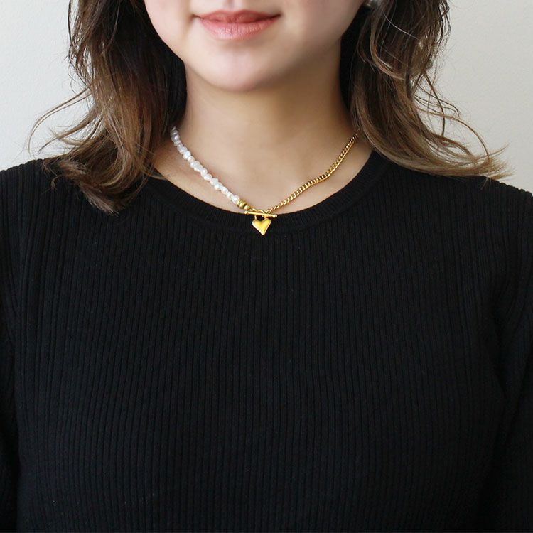 淡水パールとスタイリッシュなメタルチェーンを組み合わせたネックレス。甘すぎないシェイプの大人可愛いハートのマンテルを前にしても、ノーマルなマンテルを前にしても使える2Way仕様です。