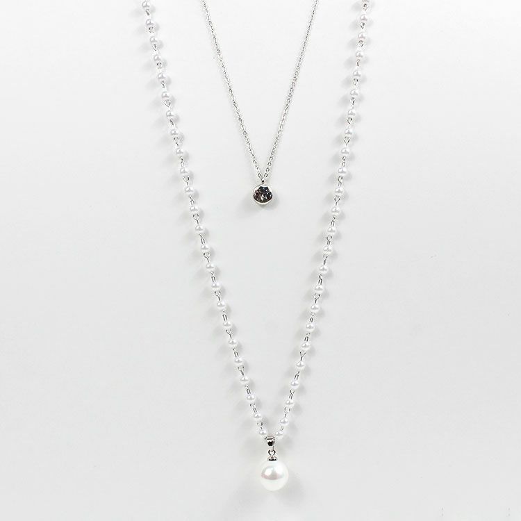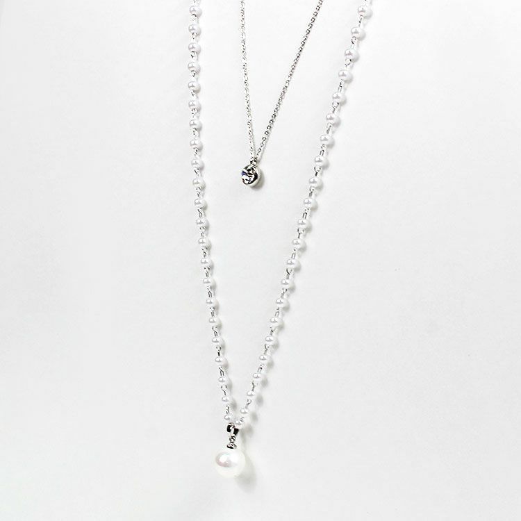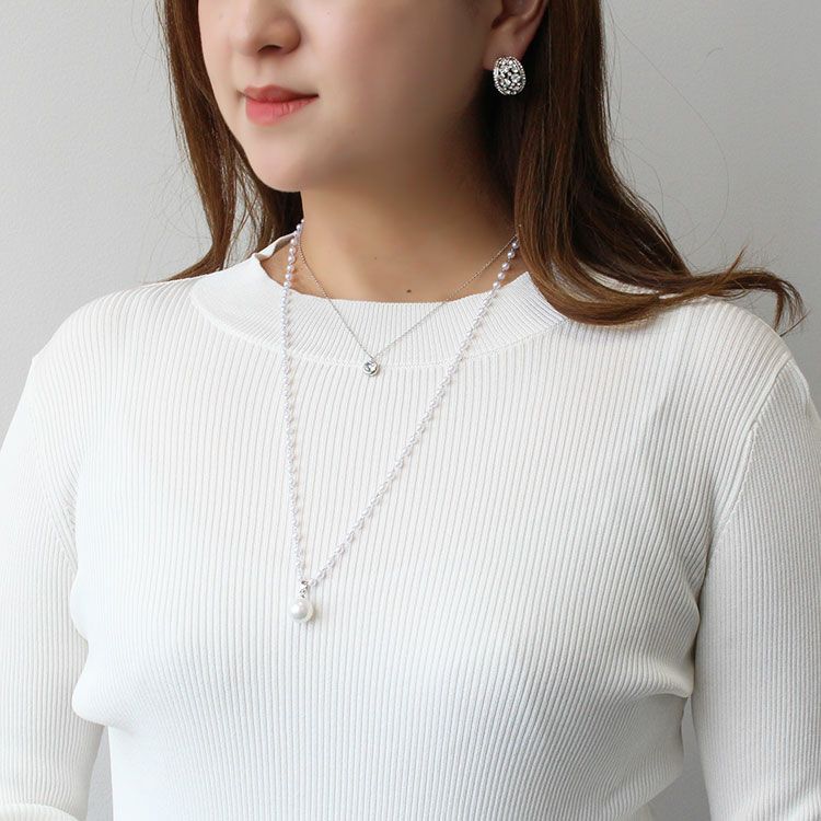 小さなパールネックレスにチェーンがレイヤードになったロングネックレス。パールネックレスには大粒のシェルパールがアクセントに。チェーンにはキュービックジルコニアが煌めき、華やな印象を与えています。軽くて使いやすいので、デイリーからオケージョン、フォーマルまで、幅広くご利用いただけます。