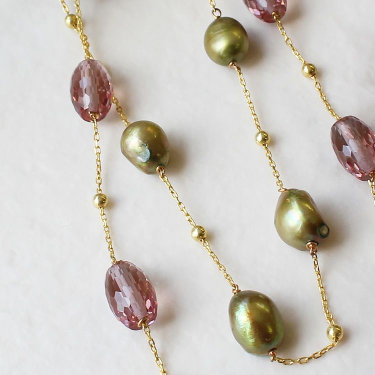 SV925+ゴールドカラーメッキ(チェーン)、淡水パール、人工ズルタナイト
