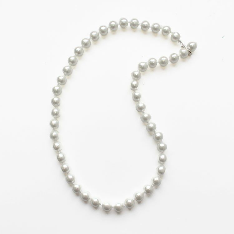 綿を圧縮して形成し、その上からパール塗装を施して作られるコットンパールは、繊維による細かい凹凸が特徴で、温かみのある質感を醸し出しています。驚くほどの軽さと、ひとつ一つが真円ではなく、少し歪んだ形状をしていることも、ナチュラルな魅力となっています。