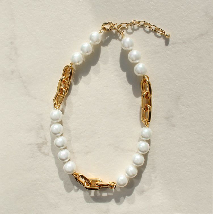 世界一の人工パールといわれるスペイン、マヨルカ島で生産されるマジョルカパールを18金メッキのデザインチェーンと組み合わせたショートネックレス。14mmの大粒パールが華やかな印象に。