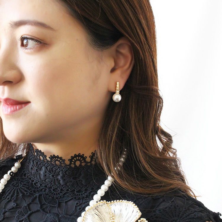 18金メッキのゴールドメタルにクリスタルガラスがきらめき、世界一の人工パールといわれるスペイン、マヨルカ島で生産されるマジョルカパールを合わせた小さめサイズのピアス。さりげなく華やぎと上品さを与えてくれます。デイリーにも使いやすく、フォーマルやセレモニーにもOKな万能デザイン。