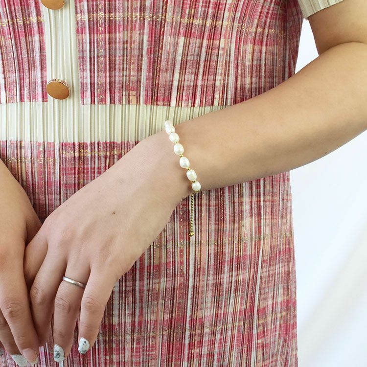 やわらかくなめらかな輝きを放つ淡水パールのデザインブレスレット。ゴールドのメタルビーズがアクセントになってキリっと洗練された雰囲気を印象付けています。シリコン入りストッパーをスライドさせてサイズ調節ができるアジャスター付きで、微妙なサイズ調整がスムーズです。カジュアルはもちろん、オフィス使い、フォーマルまでさまざまなシーンでお使いいただけます。