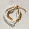 世界一の人工パールといわれるスペイン、マヨルカ島で生産されるマジョルカパールを18金メッキのデザインチェーンと組み合わせたブレスレット。華やかな三連かつシーンを選ばないデザインです。