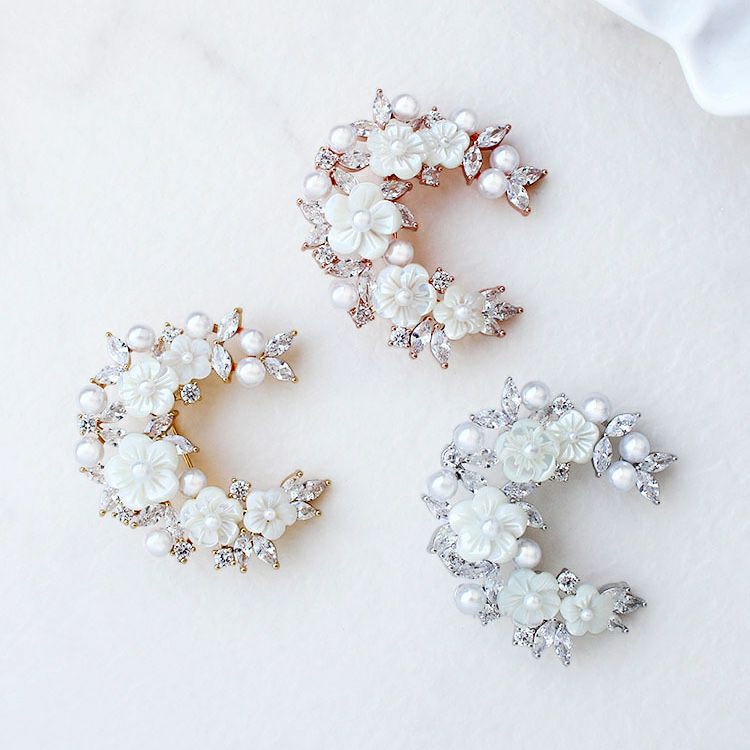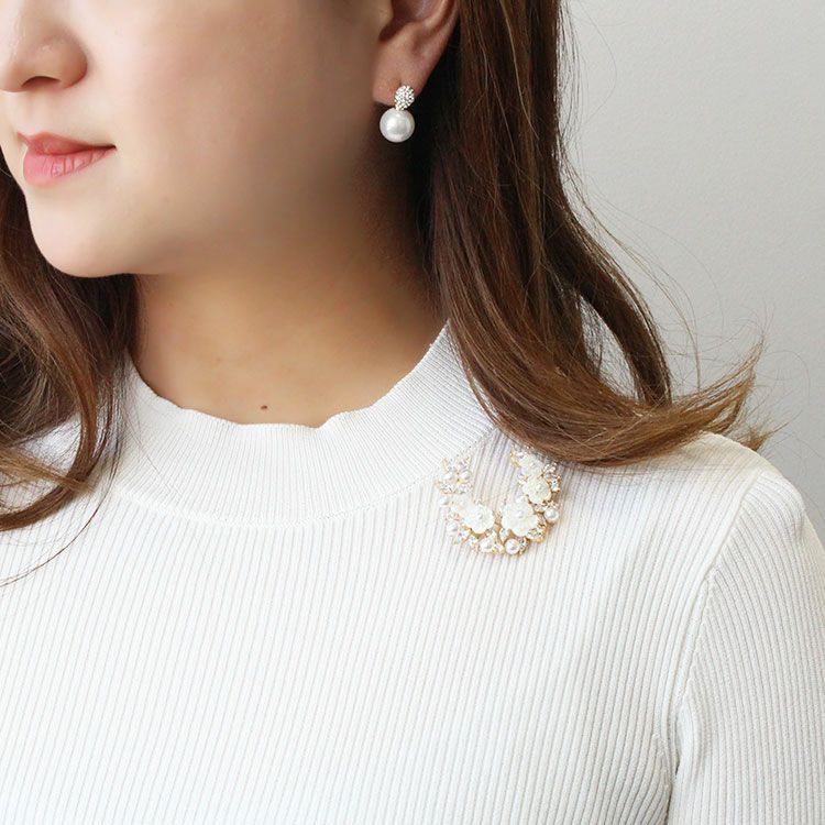 マザーオブパール(MOP)のお花に小さなパールを組み合わせたエレガントなハーフムーンブローチ。キュービックジルコニアの葉っぱが華やかで洗練された印象をプラスしてくれます。ニットやコートなどに合わせた日常使いから、セレモニーやオケージョン、パーティーシーンなど、幅広くご利用いただけます。ご自身用やギフトにもおすすめです。