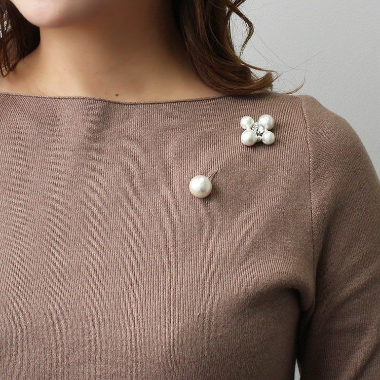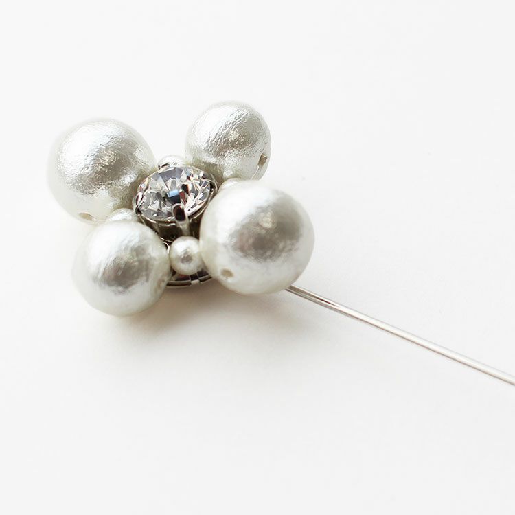 やさしげな肌触りと独特の風合いが魅力の、コットンパールのピンブローチ。大粒パールをフラワーに見立てたデザインは、中央に大きなビジューがキラリと煌めき、華やかな装いにピッタリ。パーティーからデイリーまで幅広くご使用いただけます。