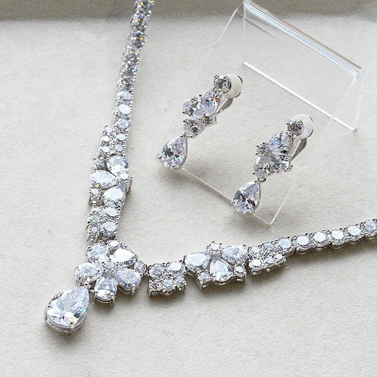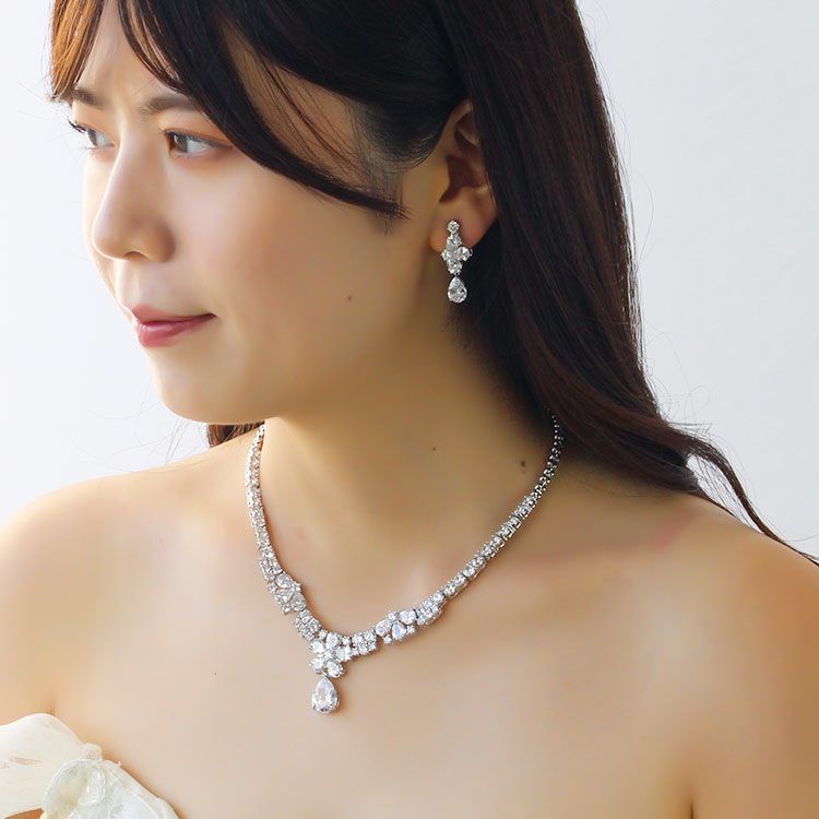 キュービックジルコニアが胸元を華やかに演出するショートネックレスとイヤリングのセット。透明度の高いジルコニアが遠目からでもキラキラと輝き、存在感を放ちます。ドロップモチーフがしなやかに揺れることでより一層煌めきが増し、華やかさが際立ちます。特別な日やパーティー、ブライダルジュエリーにふさわしいネックレス・イヤリングセットです。