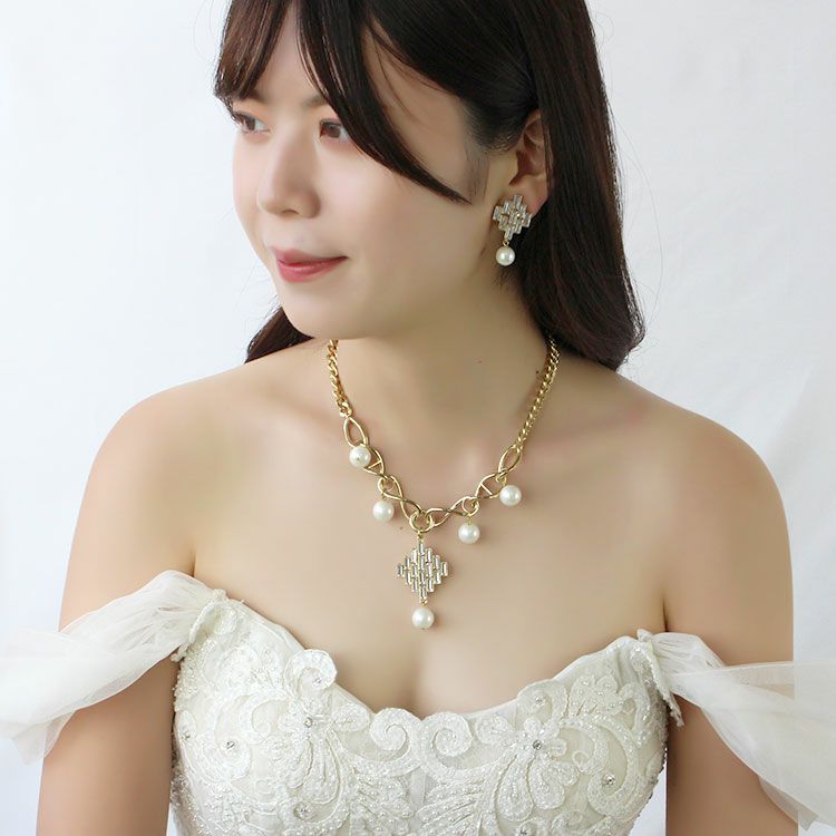 ビジュー×パールショートネックレス・イヤリングセット/1401061-2