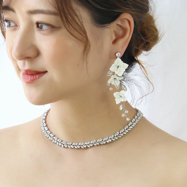 ワイヤーで枝垂れるようなデザインに仕上げた、ブライダルシーンに人気の小枝アクセサリー。軽やかな樹脂製のお花が咲き乱れ、大粒キュービックジルコニアの葉が煌めく華やかな大ぶりのイヤリングです。