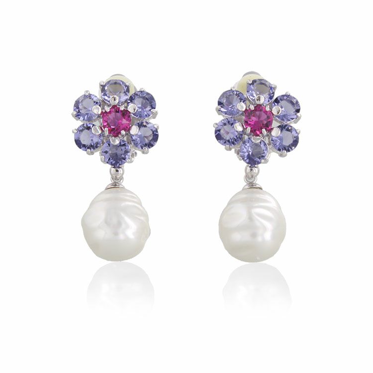 キュービックジルコニアでデザインされたフラワーモチーフに、しずく型のバロックパールをあしらったエレガントなデザイン。お揃いのネックレスと合わせれば、更に華やかに♪