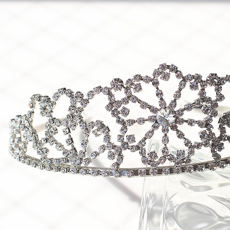 クリスタルガラスがふんだんにあしらわれた王道のプリンセスティアラ。まるでお姫様になったようなプリンセス気分が味わえます。ゴージャスなドレスにも、シンプルなドレスにもピッタリ。たちまち華やかに見せてくれます。正面に高さがあるので丸顔をカバーしてくれる効果も期待できます。柄の部分は若干伸び縮みできる素材を使用しているため多少の幅調整は可能です。