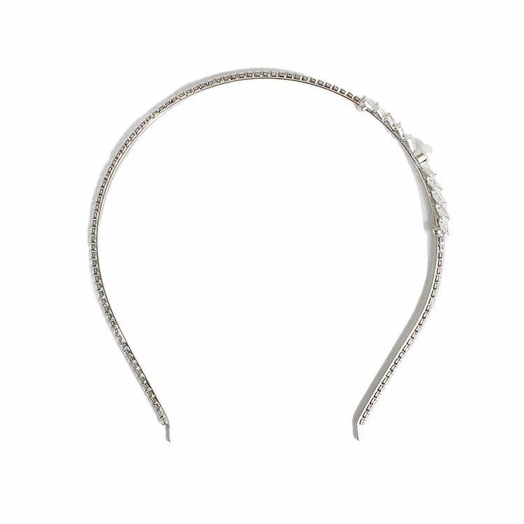 キュービックジルコニアとパールが煌めく、品の良いデザインのカチューシャ。さりげなく身につけられるサイズ感なので他のアクセサリーや服を選ばず、日常からブライダルシーンやパーティー、ステージなどでの特別な装いまで幅広いシーンを彩ります。