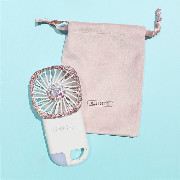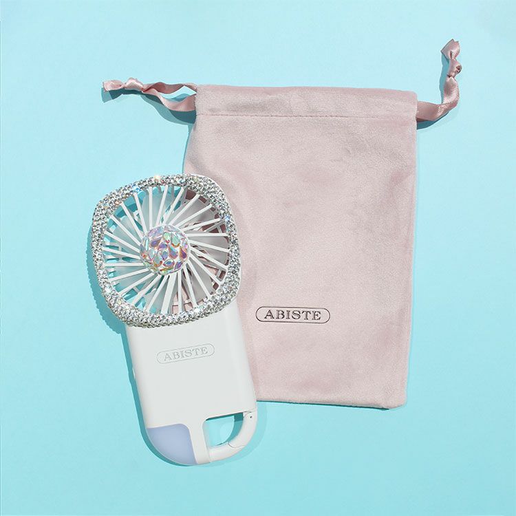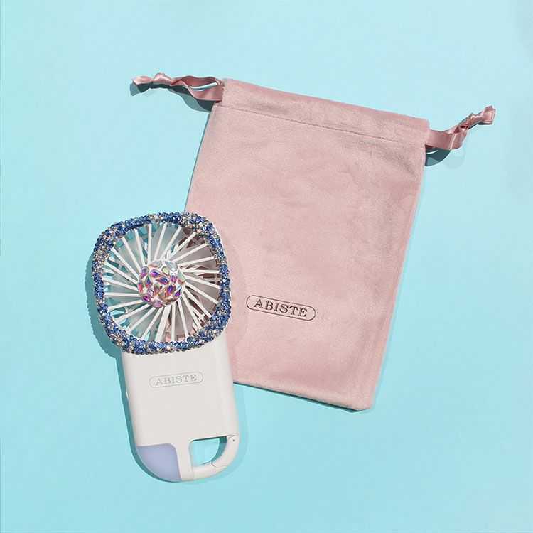 キラキラのデザインで使うたびハッピーになれそうなハンディサイズの扇風機。スリムなデザインで軽量、カラビナや巾着袋も付いているので持ち運びしやすい仕様です。風力は3段階の調節が可能。