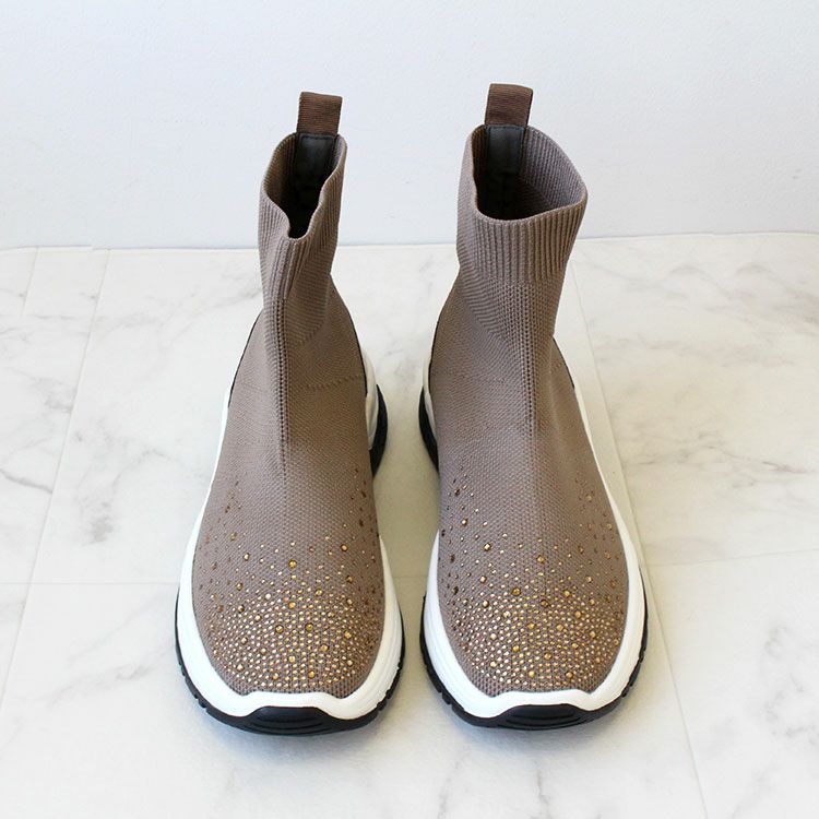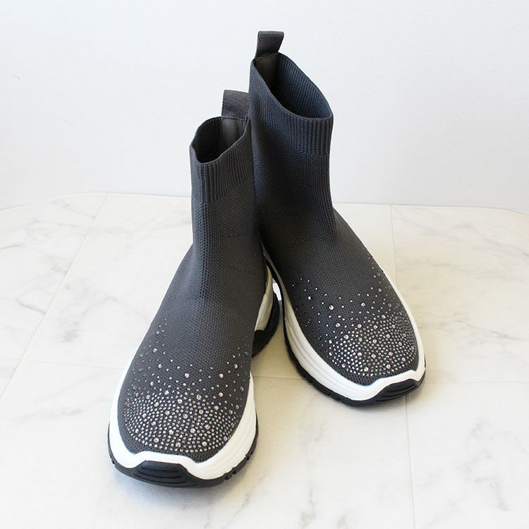 つま先に大小ビジューがあしらわれた華やかなニットブーツ。 柔らかく伸縮性があり足首をきれいに見せてくれるデザインと、ブーツながらも約340g程度と軽量な作りが特徴です。 カジュアルからきれいめなスタイル、スカートやパンツスタイルなど幅広い装いにマッチし、スニーカー感覚で快適に履いていただけます。