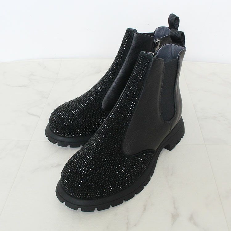 柔らかな牛革に細かなビジューが敷き詰められたショートブーツ。サイドゴアなので伸縮性がありスルッとした履きやすさも抜群です。底材には軽くて足への負担が少なく、疲れにくいのが特徴のEVA合成底を使用。優れたクッション性で歩行時の衝撃をしっかり吸収し、長時間の歩行でも快適さを保てます。 また水に強く汚れがつきにくいのでお手入れも簡単。オシャレなデザインに実用性も兼ね備えています。