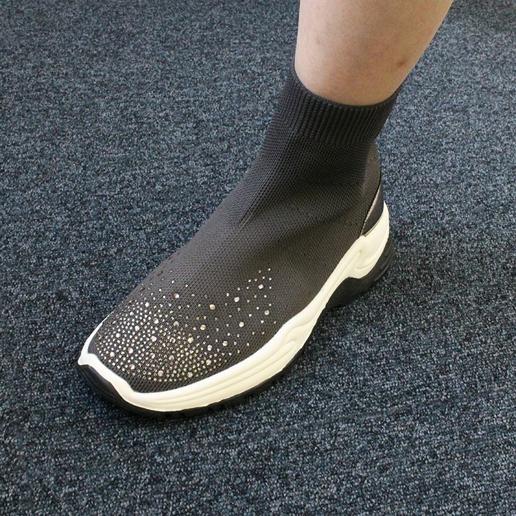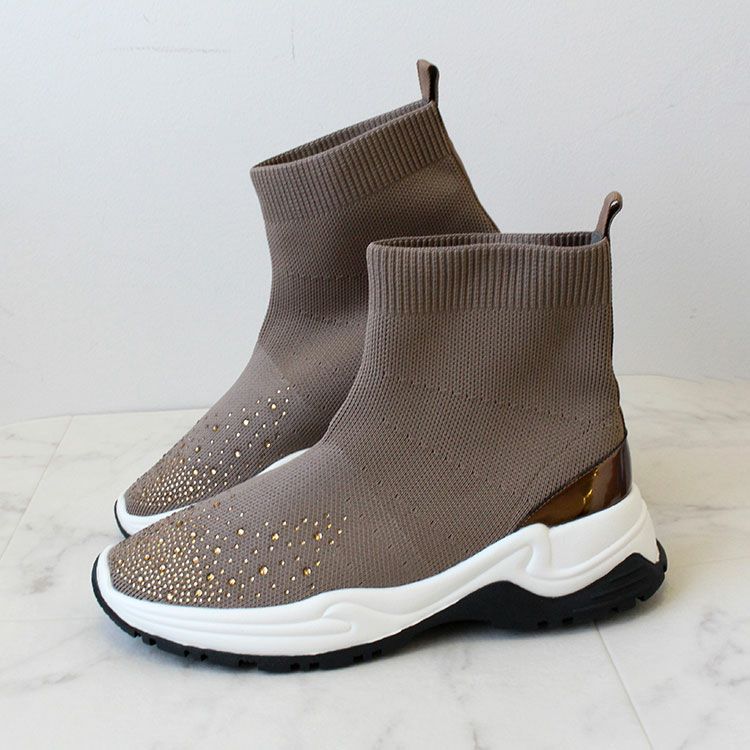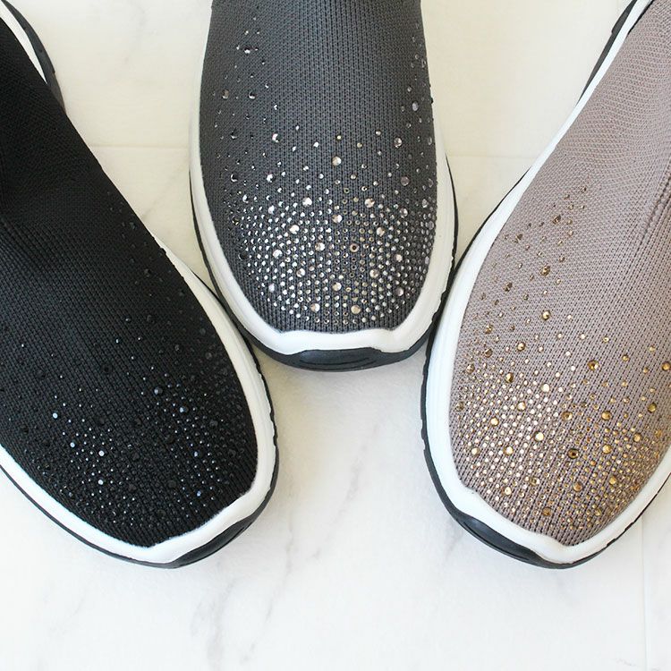 つま先に大小ビジューがあしらわれた華やかなニットブーツ。 柔らかく伸縮性があり足首をきれいに見せてくれるデザインと、ブーツながらも約340g程度と軽量な作りが特徴です。 カジュアルからきれいめなスタイル、スカートやパンツスタイルなど幅広い装いにマッチし、スニーカー感覚で快適に履いていただけます。