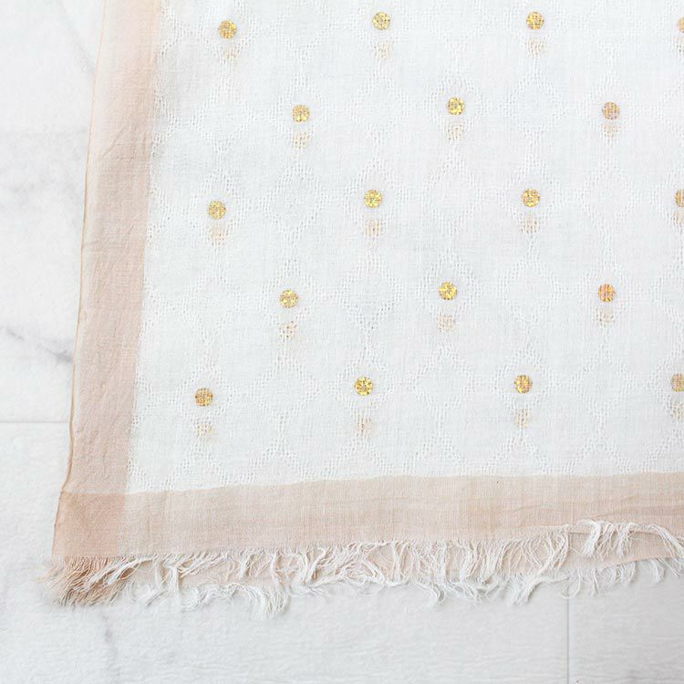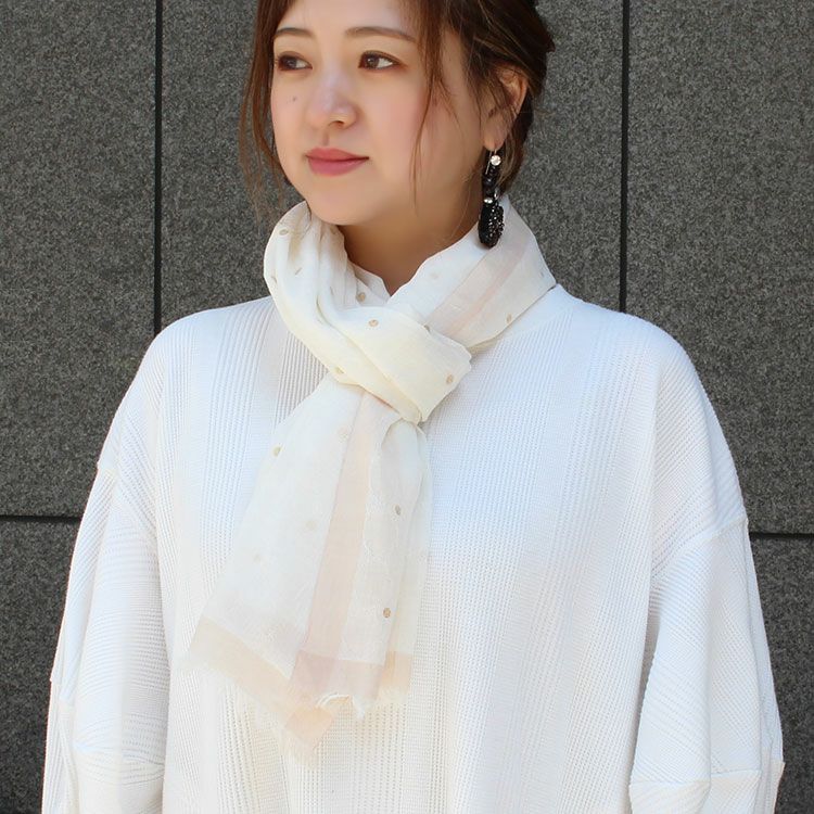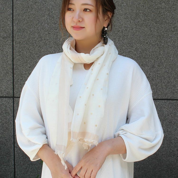 柔らかな風合いのインド綿100%ストール。綿ならではの軽やかで心地よい肌触りの良さと、素朴さと上質さを兼ね備えています。ドットプリントがナチュラルで優しい色合いに大人かわいさをプラス。薄手なので外出時に小さくまるめてバッグに入れて持ち運ぶことも可能です。