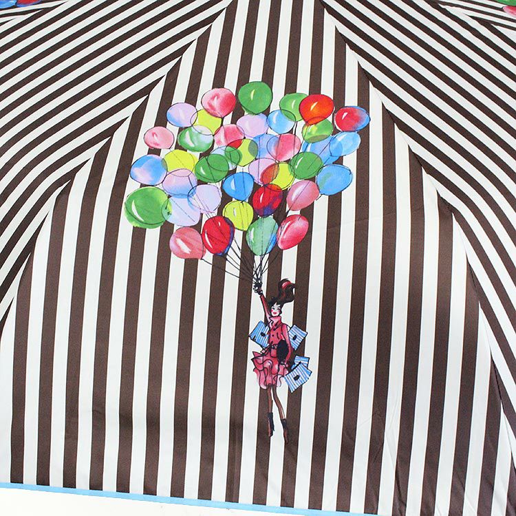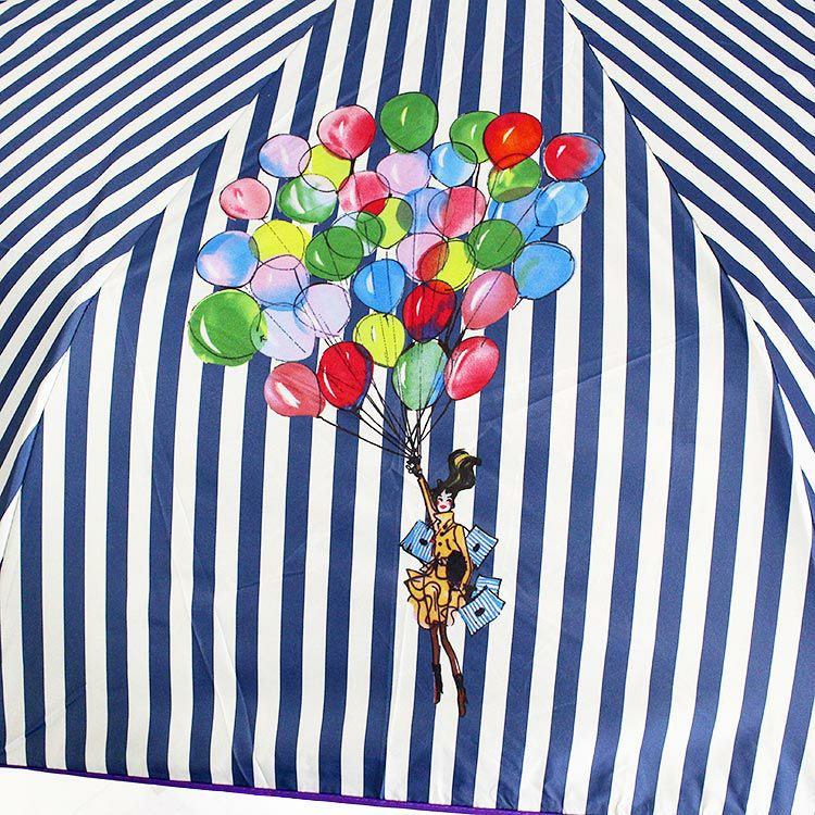 ストライプ柄にカラフルなバルーンを掴む沢山のショッピングバッグを持つオシャレな女性をモチーフにした晴雨兼用折り畳み傘。