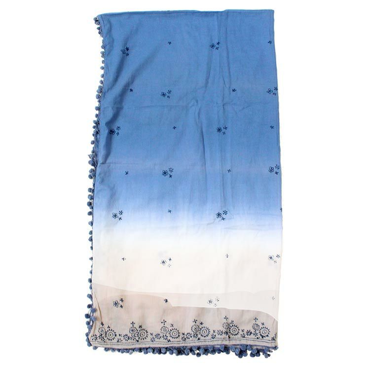 インド綿100%の大判ストール。寒暖差が大きい季節に重宝する大判サイズです。インディゴの柔らかな色味がナチュラルな雰囲気を演出。合わせやすく普段使いに最適です。インド刺繍とストールの周りのポンポンがかわいらしさを醸し出しています。