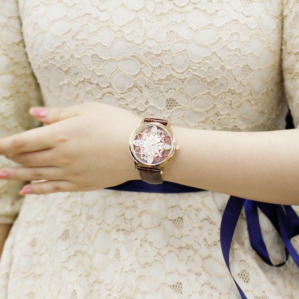 お花柄の透かし模様が軽さと透明感をプラス。上品にあしらわれたクリスタルガラスと型押しベルトが大人の気品を漂わせます。