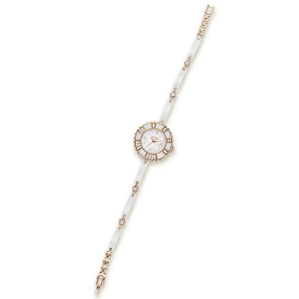 セラミックのベルトとベゼルに、ピンクゴールドを合わせた色合いが女性らしいエレガントな時計です。フェイスはMOPならではの天然の虹色の輝きで、高級感をプラス。ダイヤル、ベゼル、ベルトの随所にあしらわれたチェコストーンで華やかさも欠かしません。