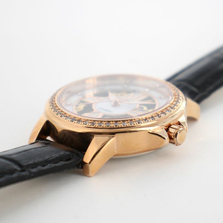 フェイスの中央からはその繊細な技術を見ることができる機械式タイプ。フェイス周りにキュービックジルコニアがあしらわられ高級感を演出しています。