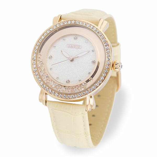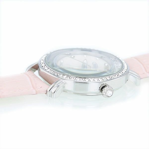 腕の動きに合わせてケース周りのクリスタルガラスも弾む、ラウンドフェイスのラメ入り時計。 ケース周りに並べられたクリスタルガラスが輝き、存在感のあるデザインです。大ぶりながら優しいベルトの色合いが女性らしさをアップしてくれます。