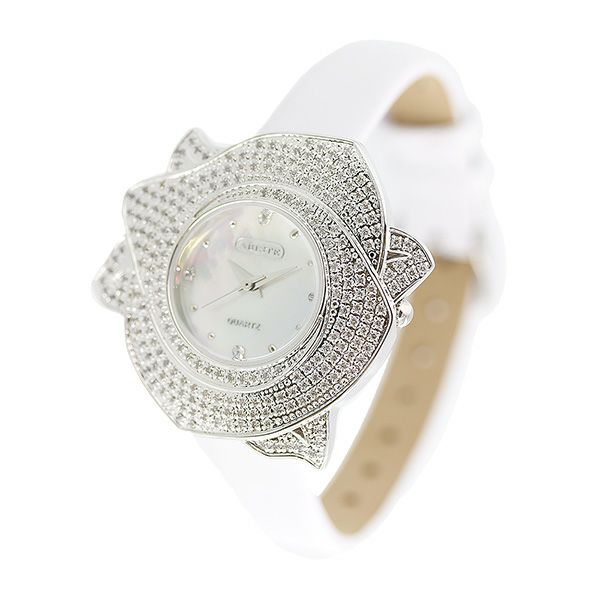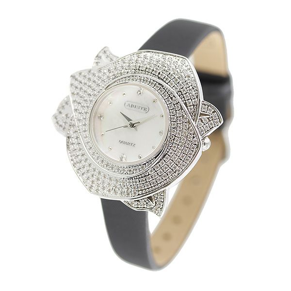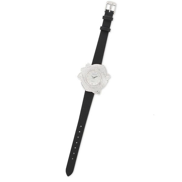 バラの花と4枚の葉をイメージしたフェイスにキュービックジルコニアを贅沢に施し、上品で可憐なデザインの腕時計。