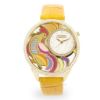 透かしになったフェイスにカラフルなルースターがデザインされた腕時計。