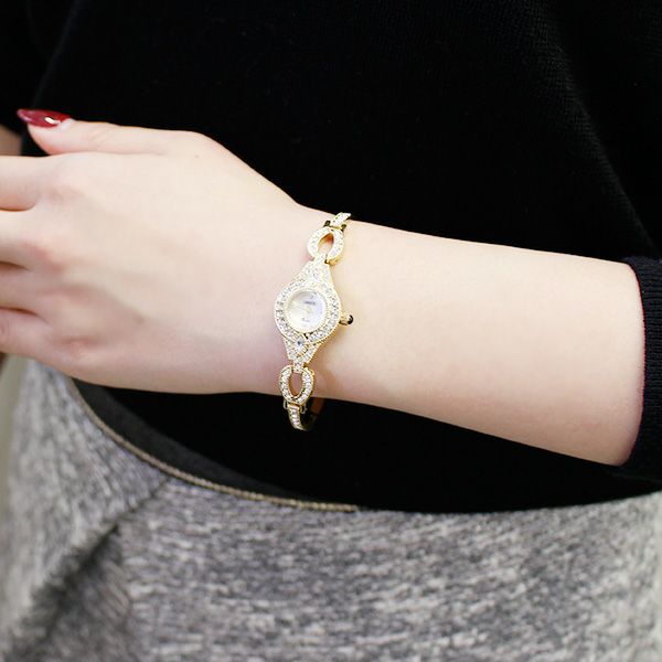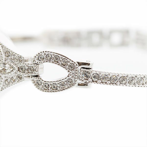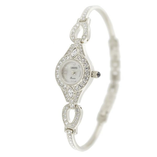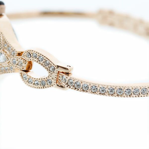 アンティーク調のケースにクリスタルガラスエレメンツをあしらったドレスウォッチ。細いバングル風のデザインが、華奢で可憐な女性を演出。結婚式などのパーティーシーンにもピッタリのデザインです。