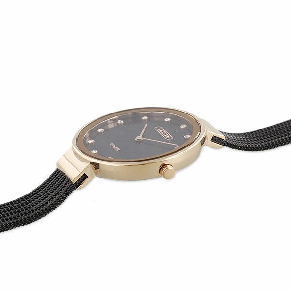 スッキリとした大きなフェイスと、文字盤にクリスタルガラスがあしらわれたシンプルなデザインの腕時計。世代や流行にとらわれず、長く愛せる洗練されたデザインの時計です。 スライド式留め具でご自身でサイズ調整が可能なので、コマ詰め不要でギフトにも最適☆