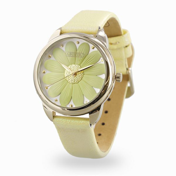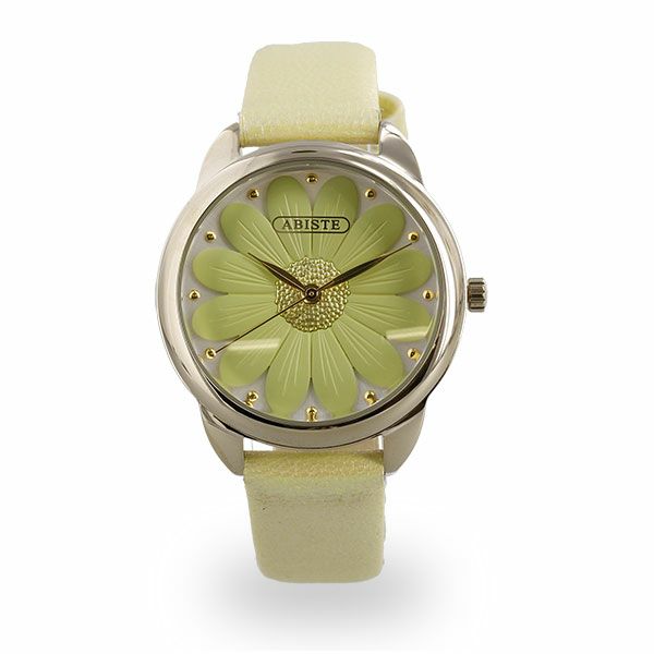 大きなフラワーモチーフが目を惹くラウンドフェイス時計。発色の良いビタミンカラーのベルトは、付けているだけで気分が高まります。 肌に当たる部分はステンレス素材を使用し、ベルトも内側は牛革を使用しています。