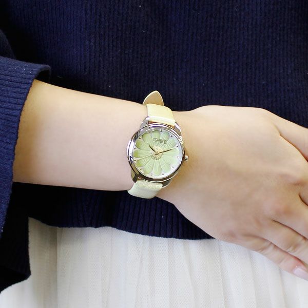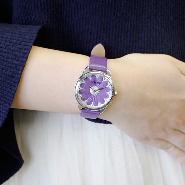 大きなフラワーモチーフが目を惹くラウンドフェイス時計。発色の良いビタミンカラーのベルトは、付けているだけで気分が高まります。 肌に当たる部分はステンレス素材を使用し、ベルトも内側は牛革を使用しています。