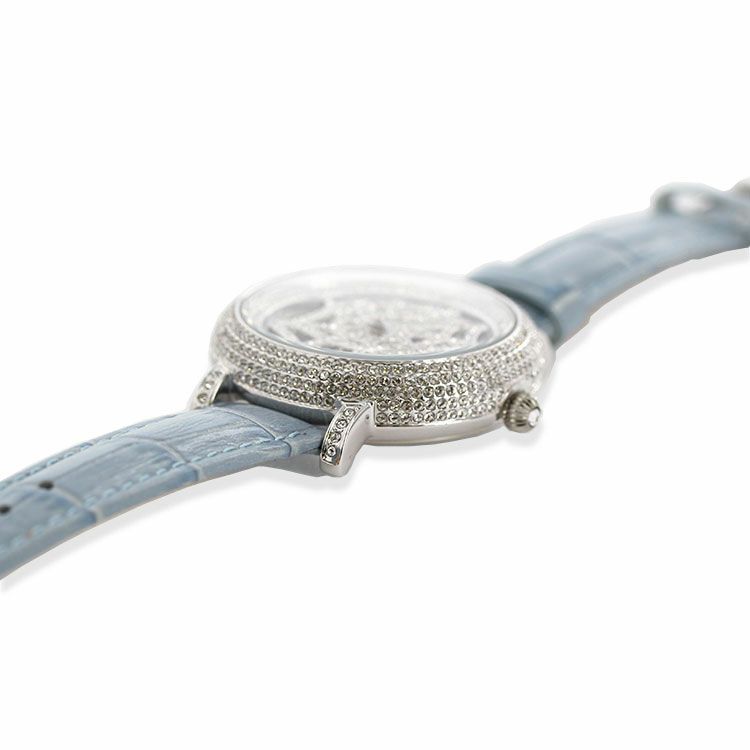 クリスタルガラスをパヴェ状に贅沢にあしらった華やかなベルト時計。秒針の先に小さな蜘蛛が遊び心を演出するフェイスには、クリスタルの蜘蛛の巣がキラキラと回転し、より華やかな雰囲気を演出します。