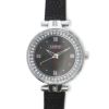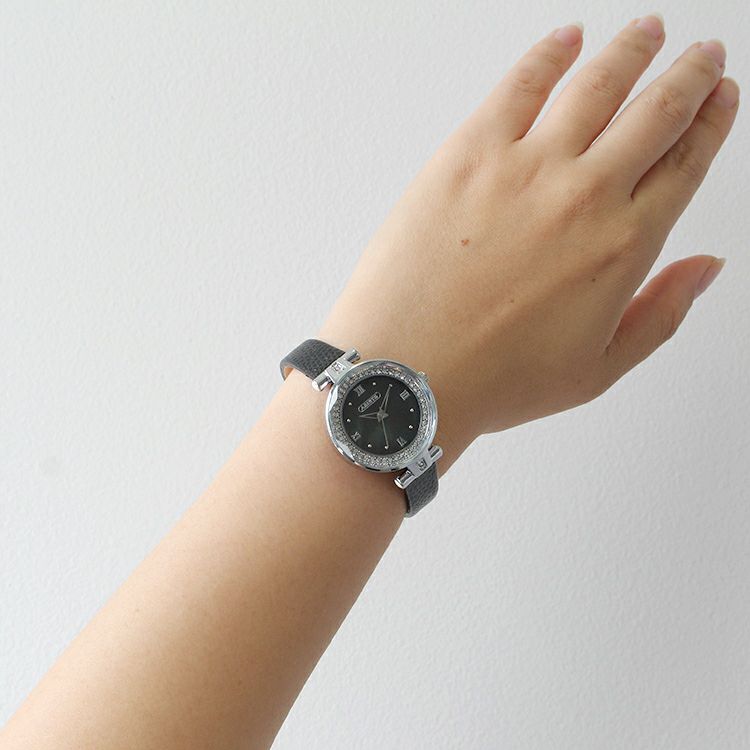 ブラックの革ベルトにラウンド型クリスタルのケースが映える腕時計。