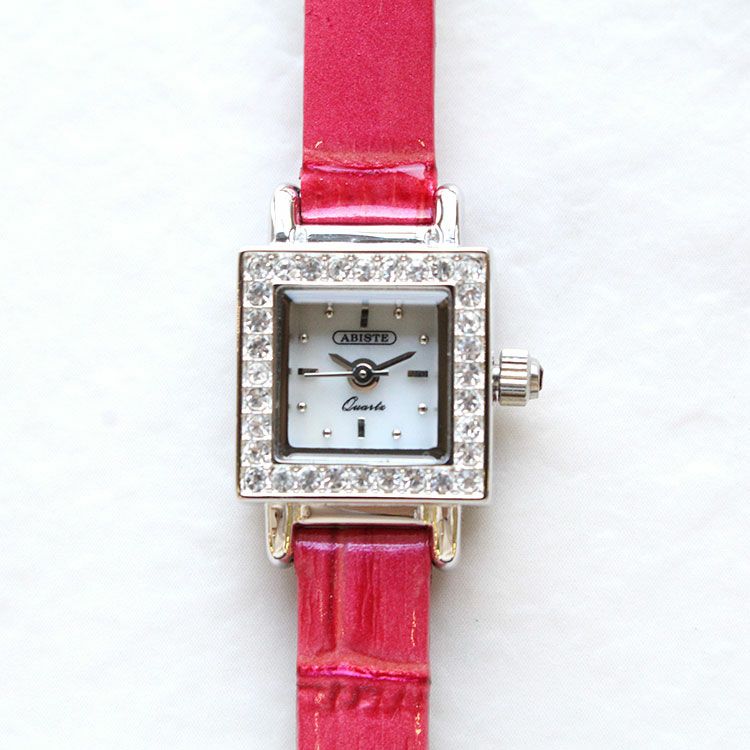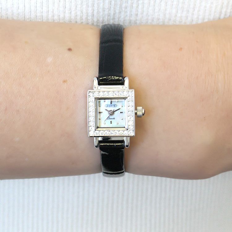 スクエアフェイスの小ぶりなベルト時計。フェイスの周りにクリスタルガラスがあしらわれ、シンプルなデザインに煌めきをプラスしています。細い革ベルトが手首を華奢に演出してくれます。