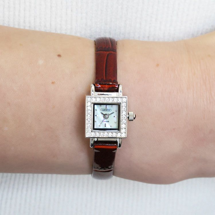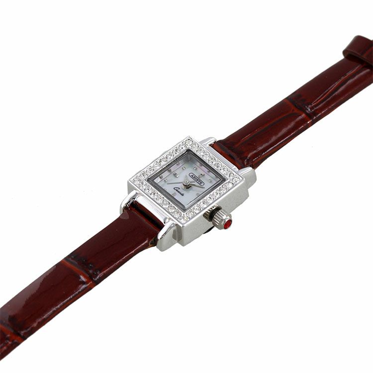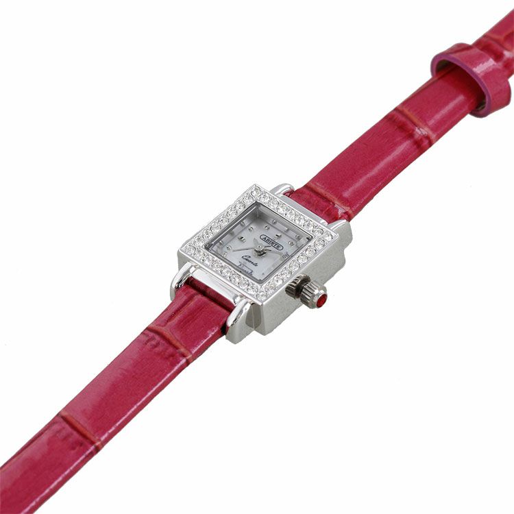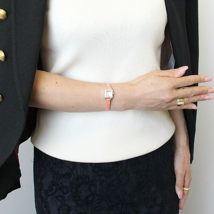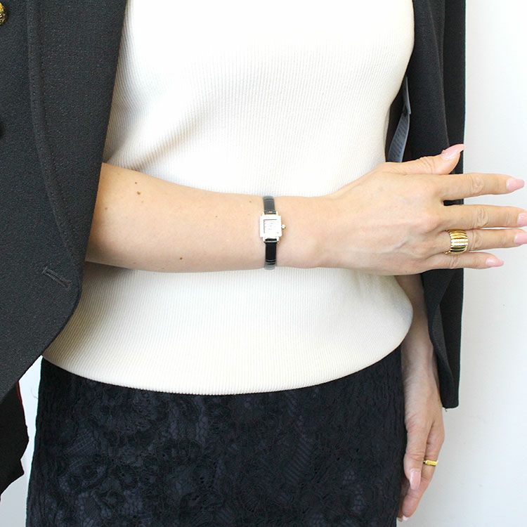 スクエアフェイスの小ぶりなベルト時計。フェイスの周りにクリスタルガラスがあしらわれ、シンプルなデザインに煌めきをプラスしています。細い革ベルトが手首を華奢に演出してくれます。