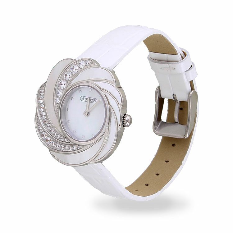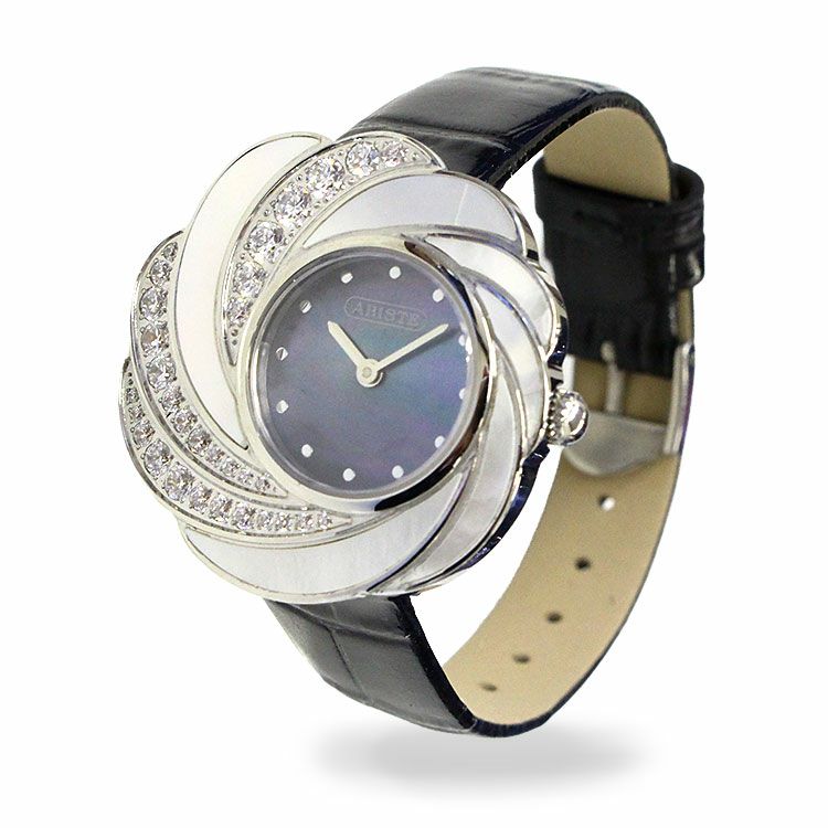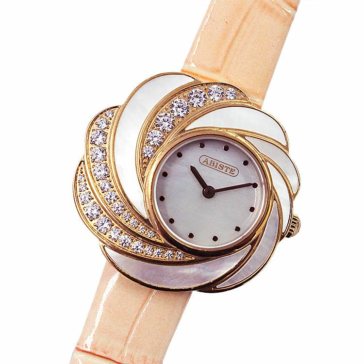 特徴的なベゼルのデザインが目を引く腕時計。文字盤にはMOP(真珠母貝/白蝶貝)を使用し、ナチュラルな虹色の輝きが品のある美しさ。