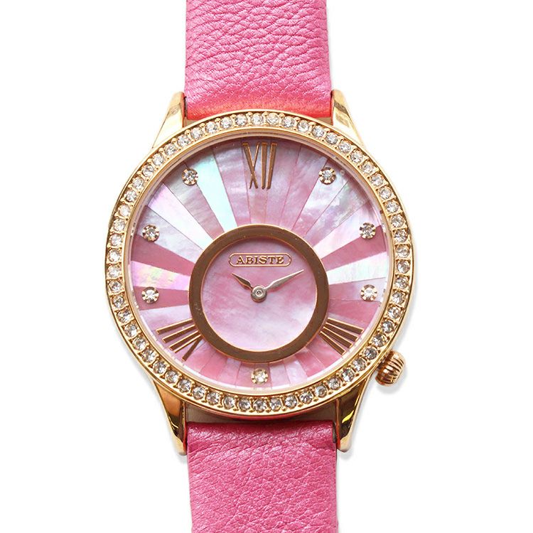 ベルトカラーと同系色のシェルを文字盤に放射状にあしらった上品な腕時計。フェイスの周りにはクリスタルガラスをあしらったアビステらしい人気のデザインです。