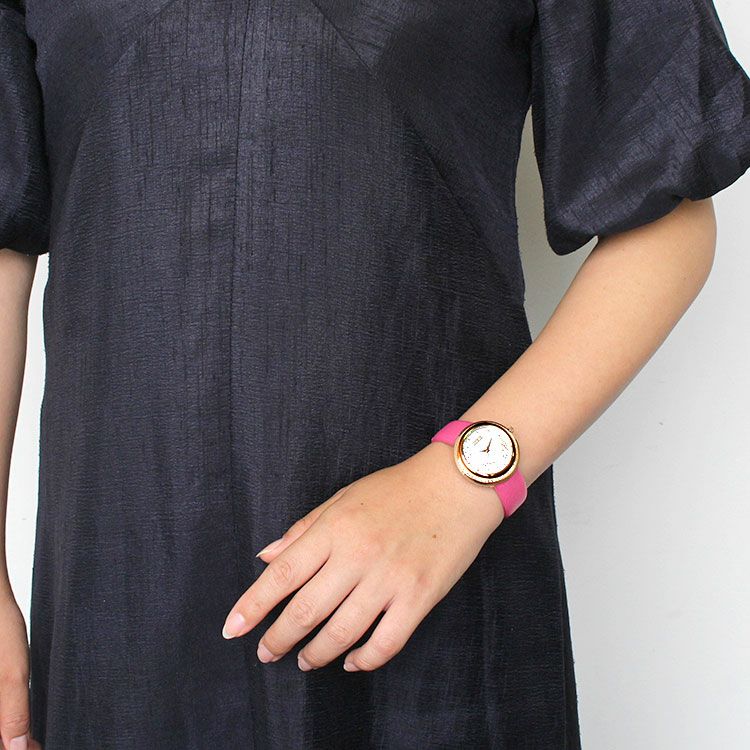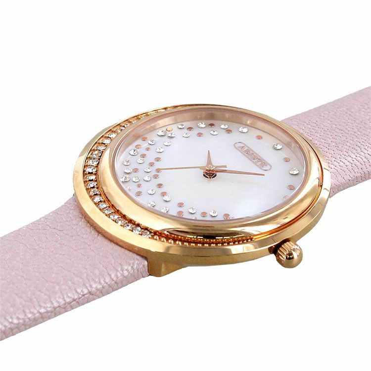 文字盤にチェコストーンがちりばめられたラウンドフェイス腕時計。ケースにも文字盤と同じようなイメージで、左下から右上にかけてクリスタルガラスが華やかにしきつめられ、洗練された大人かわいさを備えたデザインです。普段使いはもちろん、オフィス使い、パーティーシーン、プレゼントにもおすすめです。