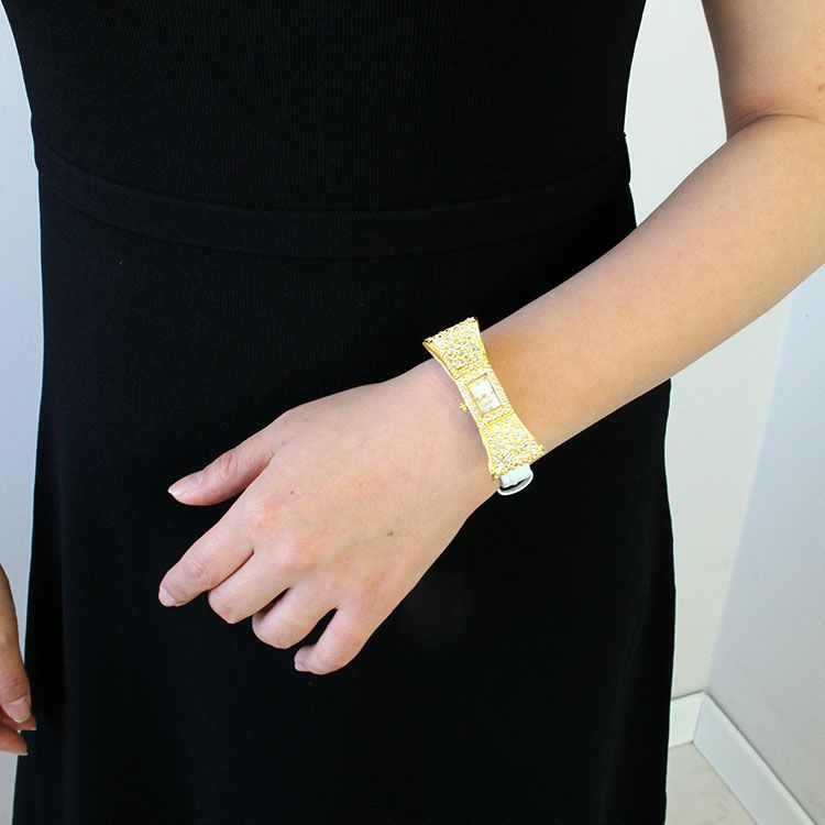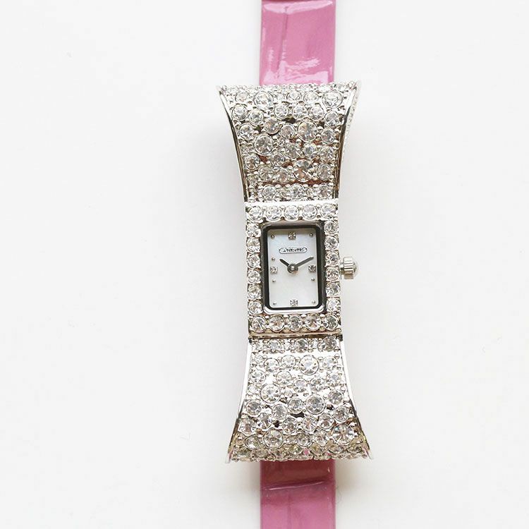 大きなリボンにチェコクリスタルガラスが敷き詰められた大人かわいいベルト時計。しっかりリボンが感じられる存在感のある大きさはジュエリー感覚でもご利用いただけます。