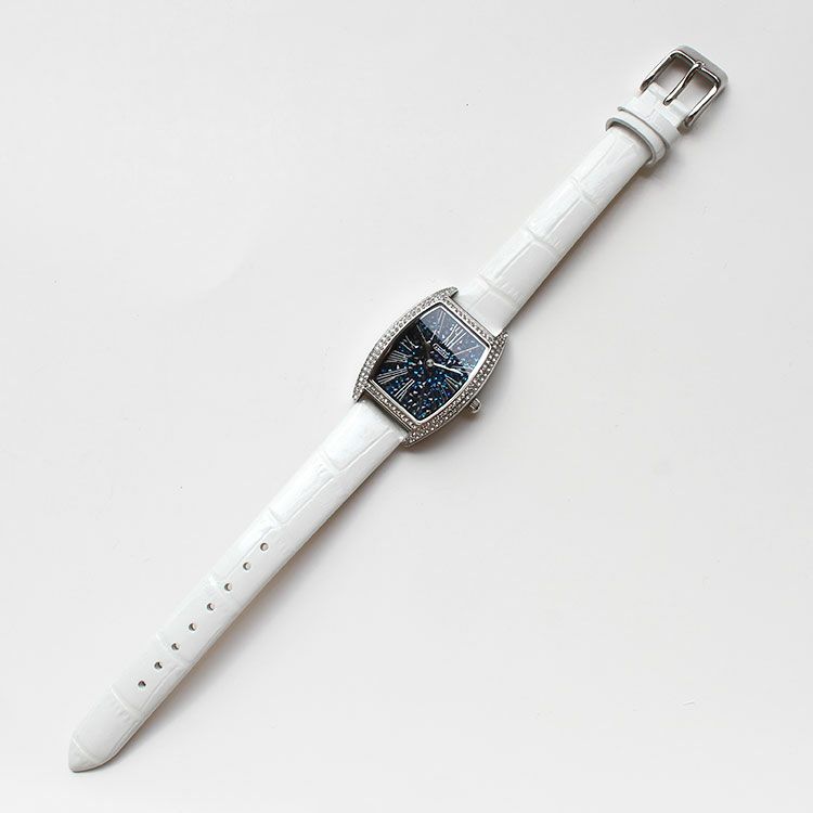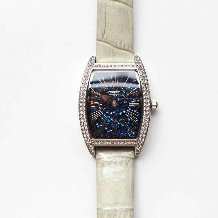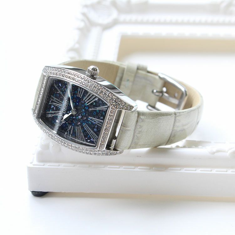 ブルークリスタルガラスの文字盤が美しいトノーベルト時計。ベゼルには一般的なクリスタルガラスよりもカット数が多く、美しい輝きが特徴のクリスタルガラスを使用し、キラキラと煌めくクラス感を演出。ご自分用はもちろん、プレゼントにも最適です。