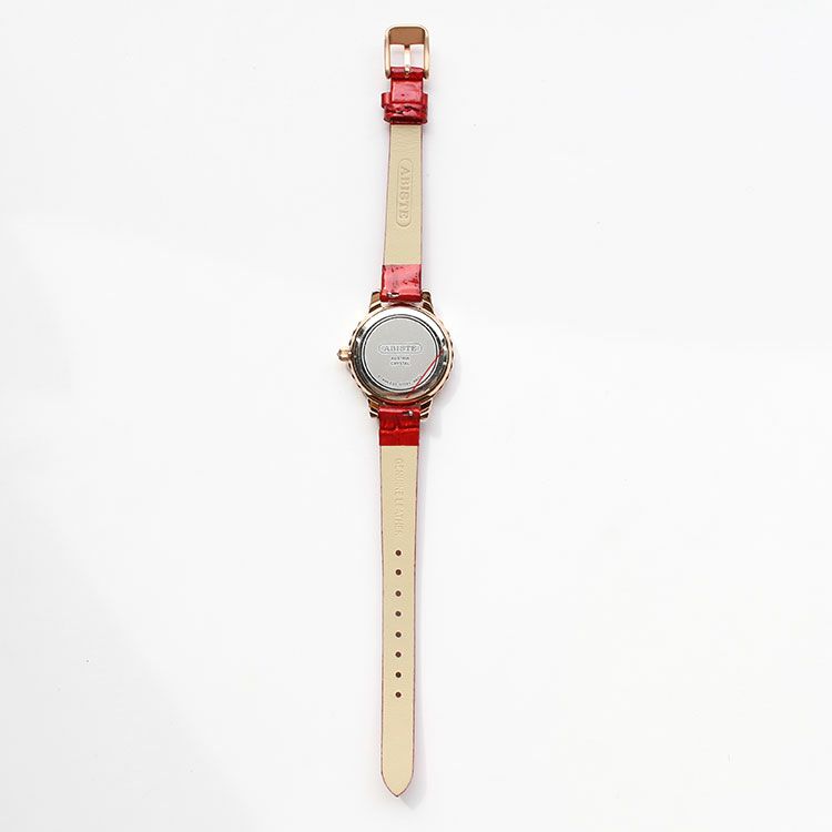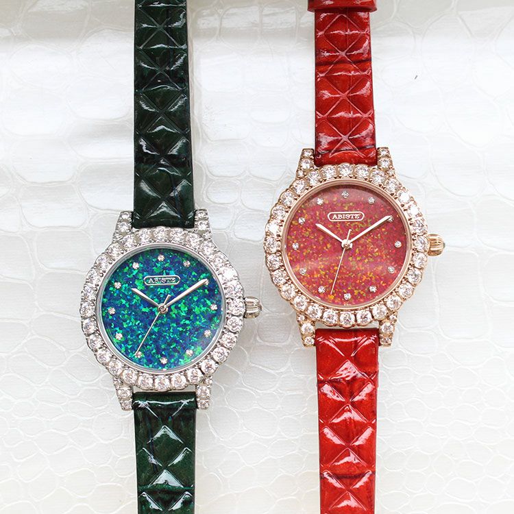 人工オパールの文字盤の遊色が美しいラウンドベルト時計。ベゼルにはチェコストーンが囲み、キラキラと煌めくクラス感を演出。インデックスには一般的なクリスタルよりもカット数が多く、美しい輝きが特徴のクリスタルガラスを使用しています。ご自分用はもちろん、プレゼントにも最適です。