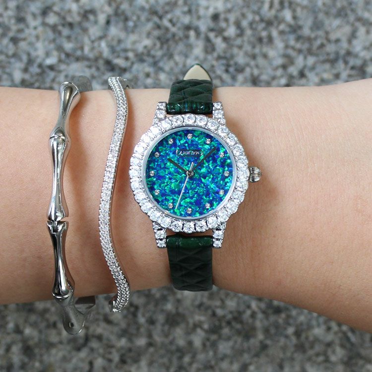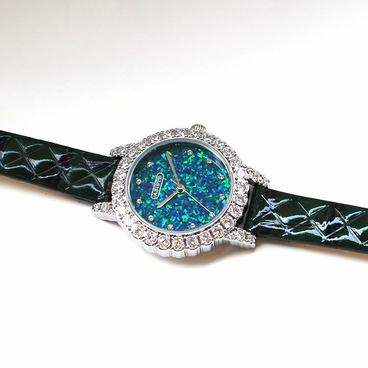 人工オパールの文字盤の遊色が美しいラウンドベルト時計。ベゼルにはチェコストーンが囲み、キラキラと煌めくクラス感を演出。インデックスには一般的なクリスタルよりもカット数が多く、美しい輝きが特徴のクリスタルガラスを使用しています。ご自分用はもちろん、プレゼントにも最適です。