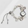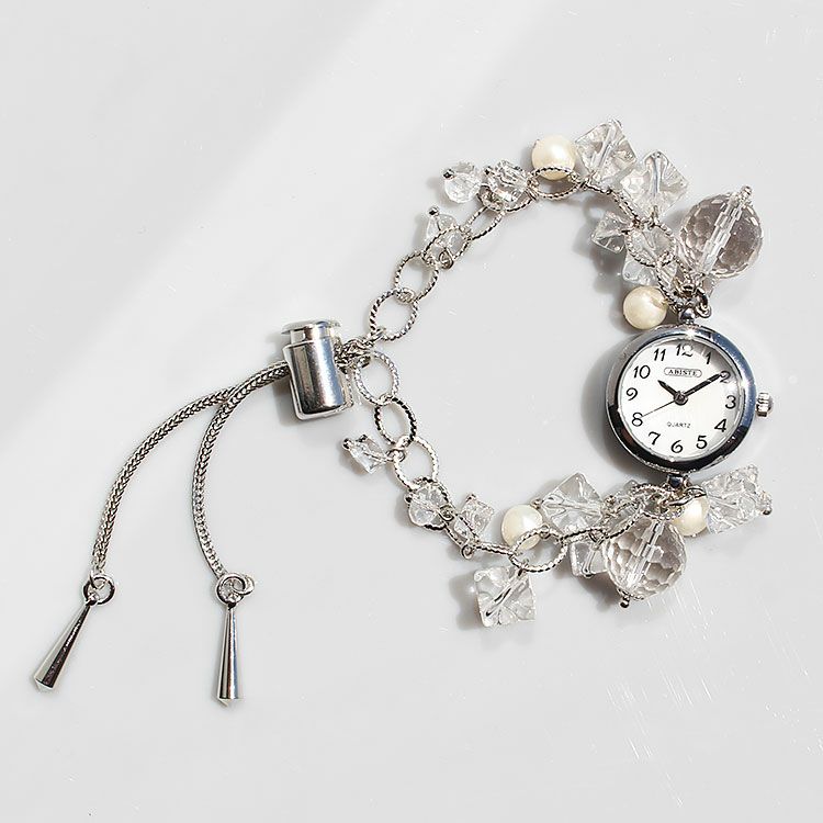 クォーツの中でも無色透明で純度の高い天然クォーツを使用したロック・クリスタル(本水晶)を様々な形にカットし、淡水パールとチェーン部分にあしらったブレスレット時計。