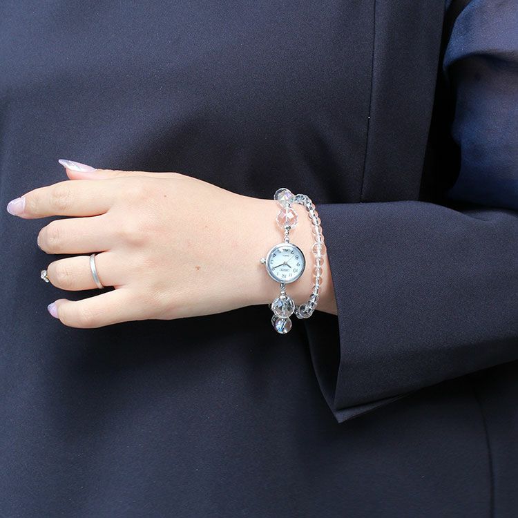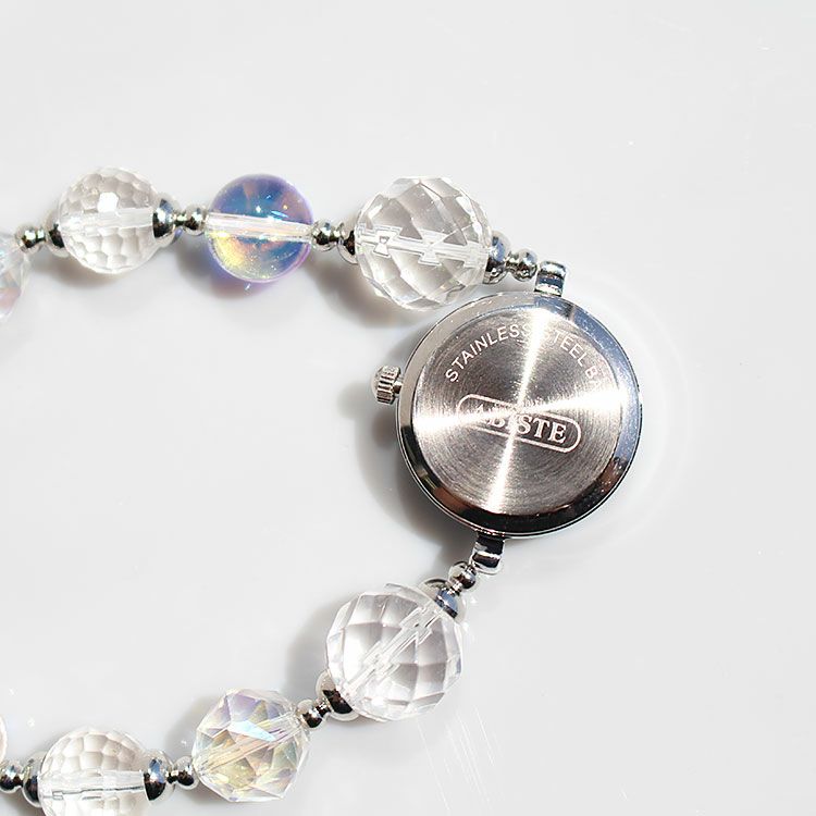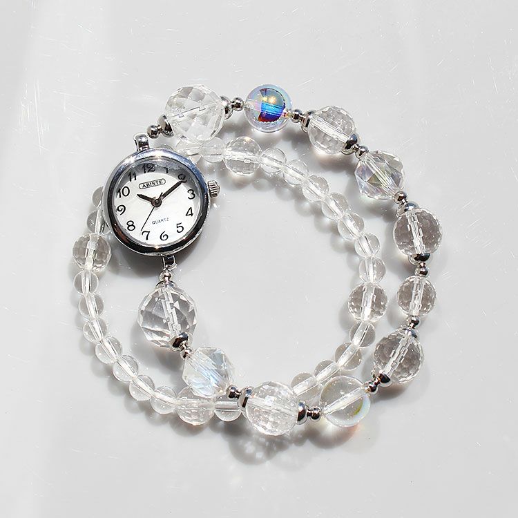 クォーツの中でも無色透明で純度の高い天然クォーツを使用したロック・クリスタル(本水晶)と、表面に虹彩被膜処理を行ったクォーツを組み合わせたブレスレット時計。時計単体でも付属のブレスレットと重ね付けして2連でもお楽しみいただけます。