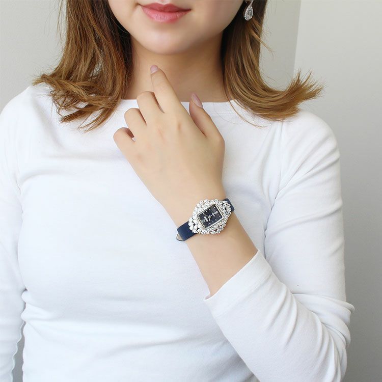 キュービックジルコニアをふんだんにあしらったラグジュアリーな腕時計。レクタングルフェイスの文字盤は、ブラックに近い深みのあるネイビーに、細かいキラキラの粒が美しく煌めく石を使用。まるで星空のような、ロマンチックな輝きを宿します。