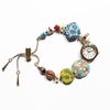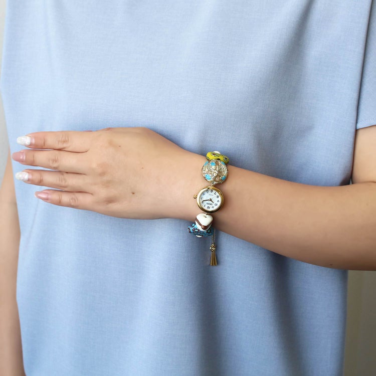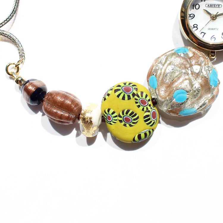 平ら(フラット)な形状に装飾が施されたフラットファンシービーズやヴィンテージビーズの組み合わせが印象的なベネチアンガラスブレスレット時計。