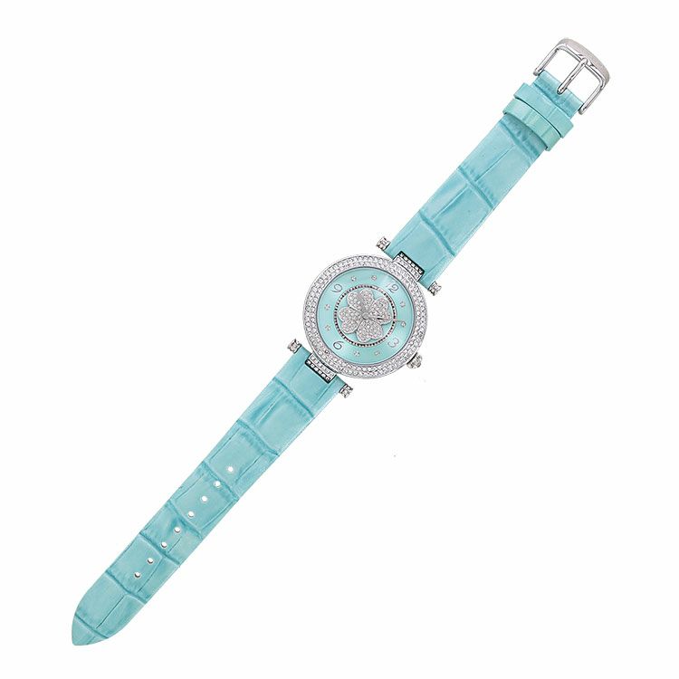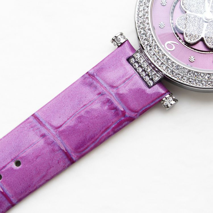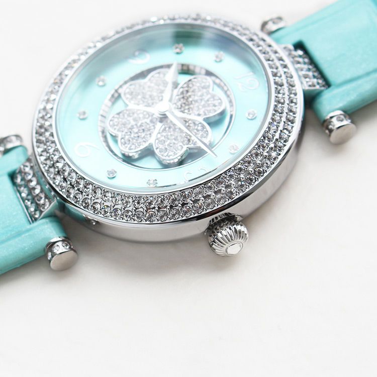 動くたびにクローバーモチーフがクルクルと回転する腕時計。微細なラメ感のある革ベルトは、防水加工を施した牛革を使用しています。オーストリア製クリスタルガラスを随所にふんだんに用い、まるでジュエリーウォッチさながらの華やかさに。